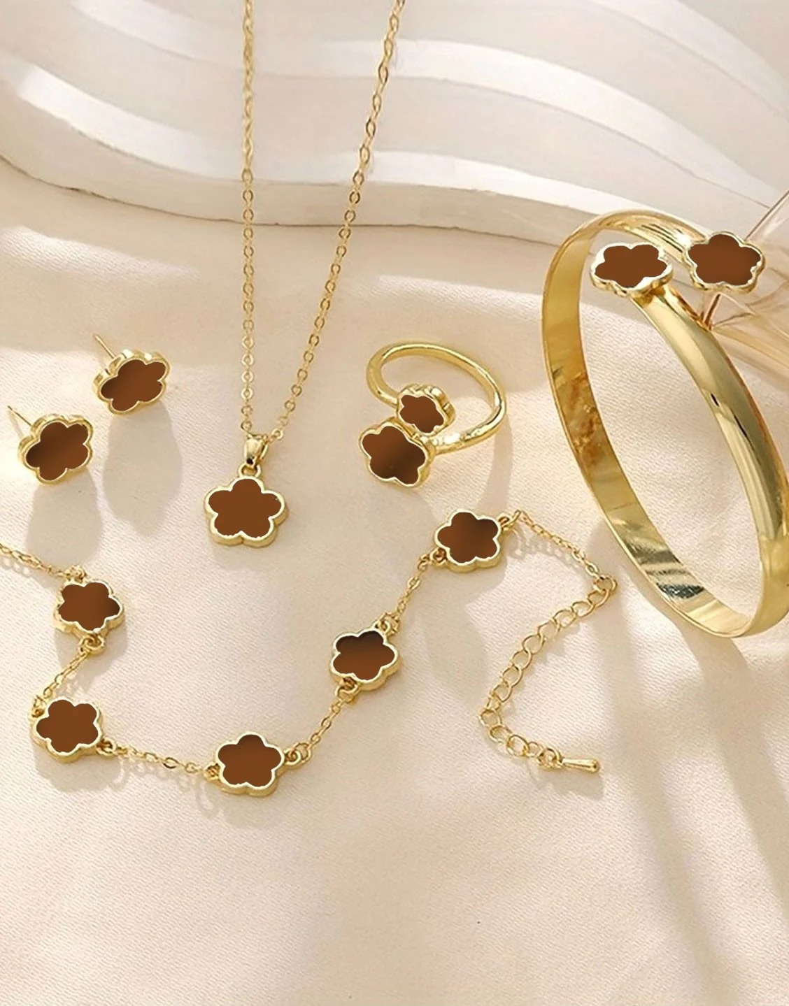 5-Piece Brown Five Leaf Clover Design Jewelry Set includes Bracelet, Earrings, Kara, Necklace & Ring